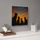 Artwork of cat silhouettes gazing upon a sunset. This piece combines the cat silhouette theme with a warm, autumnal scene at sunset. A heartwarming and vibrant depiction of four feline figures gathered to observe the setting sun. The bright, pristine white silhouettes of the cats contrast sharply with the richly textured, glowing sky, creating a comforting yet dramatic atmosphere. This artwork is an excellent choice for a room where you want to foster a sense of home and warmth. The vivid colors make it an instant focal point, and the beloved subject matter appeals to cat loves and anyone who appreciates the beauty of twilight landscapes. It has a modern, clean look due to the sharp white silhouettes.