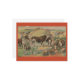 Nötkreatur, omringad av boskap, och jockeys tävla hästar på ett racetrack ovanför, på denna vackra gård och idrottsepida. Orange Red gräns.