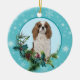 På framsidan av denna Helgdag är ett vackert porträtt av en Cavalier Kung Charles Spanska hund som är inramad i en holly och evergreen bough. Röda bär och gräs-koner dekorerar huggen och gräs sprickor. Bilden placeras på en blek blå cirkel som ramas av ett retroblått snöflingor mönster. Baksidan av dekorationen har samma bakgrund och cirkel med anpassningsbarnas text i blått.