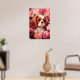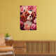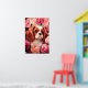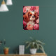 En närliggande porträtt av en blenheim Cavalier Kung Charles Spaniel-valp, utgiven i en painterly stil. Hund har en vit och brun jacka med stort, uttrycksfullt brunt ögon. Det omges av en överström av rosa och persikofärgat ro som skapar en mjuk och romantisk atmosfär. Hund:s päls är noggrant beskrivet, där struktur fångas upp och det långa, silkesaktiga håret flödar. Perfekt för kavie älskare.