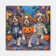 De berömvärda Cavalier Kung Charles-spanjorerna som är klädda i lekfulla Halloween-kostymer bär pumphus medan de lurar eller behandlar under det månbelysta himmel. Denna festliga utformning belyser rasens silkesaktiga jacka, milda uttryck och artiga personlighet, som perfekt fångar den förevändning som roligten av Halloween-natten har. En charmerande firande för hundälskare och Halloween fläkt.