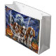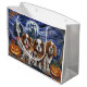 Släpp upp spookandan med den här eerie Halloween-designen med en hundar-förpackning under en mörk, månbelyst himmel, omgiven av flygande fladdermus och glödande pumpor. Perfekt för dem som kärlek en aning skrämmande roligt med sina hårigets vänner!