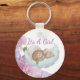 Celebrate Baby Shower Its a girl keychain. Featuring a sweet, hand-drawn illustration of a baby girl peacefully sleeping on a soft, fluffy cloud, this design is framed by a delicate border of watercolor flowers in shades of lavender, purple, and soft pink.