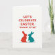 This card features a simple spring-themed layout with lots of white space and a crisp, modern look. Across the upper area, large crimson red text reads “LET’S CELEBRATE EASTER. ‘BUNNY STYLE’.” with small red dots acting like neat pauses between the words. Below the message, two sleek rabbit silhouettes face each other as if sharing a quiet, friendly moment 🐰. The left rabbit is bright red, turned toward the right, while the right rabbit is a deep teal, angled back toward its companion, creating a tender face-to-face connection. Each figure sits on the white background with a faint gray shadow under its base, giving a slight lift from the page. The strong red lettering above balances the two-color rabbits below, keeping the design focused and easy to take in 🌷. The scene shows the red and teal rabbits centered beneath the red headline, with soft gray shadows resting directly under their feet on the white field.