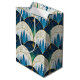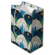 An abstract blue and gold pattern depicting the forest and the night sky in a pattern of Art Deco arches