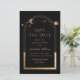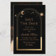 Celestial Black Spara datumet Födelsedags Quinceanera-inbjudan har en guld sol, måne och stjärnor ram på en svart bakgrund. Inuti finns din anpassade Quinceanera spara datum information och på baksidan lägg till ditt favoritfoto. Anpassa genom att redigera texten i textrutorna. Designad för dig av ©2024 Evco Studio www.zazzle.com/store/evcostudio