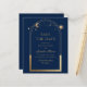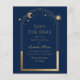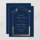 Celestial Blue Spara datum födelsedag Quinceanera Inbjudan har en ram med guld sol, måne och stjärnor på en blå bakgrund. Inuti finns din anpassade Quinceanera spara datum information. Anpassa genom att redigera texten i textrutorna. Designad för dig av ©2024 Evco Studio www.zazzle.com/store/evcostudio