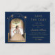 Celestial Blue Save Den fjärde inbjudan till födelsedagskvällen har en blå bakgrund i guld sol, måne och stjärnorna ram. Inuti finns ditt favoritfoto och din anpassningsbar Quinceanera sparar datuminformationen. Anpassa genom att redigera texten i textrutorna och lägga till ditt favoritfoto. Designad för dig ©2024 Evco Studio www.zazzle.com/store/evcostudio