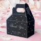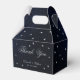 En mörk marinblå presentask med gyllene stjärnor för ett marint och silverfärgat himmelskt bröllopstema. På båda sidor har den meddelandet Tack och namnen i elegant kalligrafi (och datumet i mindre siffror under namnen). All text är ljusgrå och kan ändras.