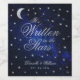 För ett celestial bröllop med temat "Den är skriven i Stars". Texten är omgiven av måne och stjärnan på en stjärnblå nattblå bakgrund. Måne, stjärnorna och titeln är faux silver, resten av texten är ljust grått, nästan vitt. Rubriken och namnen brid och groom skrivs i ett kalligrafiskt skript för elegant. Fotot från stjärnnatten är av Felix Mittermeier från Pixabay och det är gratis för kommersiell använda.
