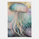 Den här teckningen har en mesmerierande maneter, dess klocka som återges i ett mjukt spektrum av pastellkritor, blåsor och lila, med känsliga, ljusreflekterande strimmor. Dess långa, flytande tentakler går nedåt i en kaskad av liknande färg, vilket skapar en känsla av en graciös och ulerande rörelse. Bakgrunden är ett drömliknande, abstrakt fyllt med flytande, orbliknande former i muterade skuggor av guld, lavender och rosa, vilket antyder en mystisk undervattensmiljö eller till och med kosmisk omgivning. Biet blandar ihop en känsla av biologisk realism med en surrealistisk, eterisk atmosfär som framkallar djuphavets och mystiska liv.