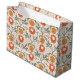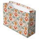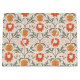 A seamless pattern featuring stylized sun faces, blooming orange flowers, curling clouds, and leafy green vines on soft beige background.