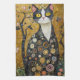 Den här bilden har en fantastisk katt som återges i det konstnärliga stil som påminner om Gustav Klimt. Katten, med sin slående gult ögon, vit och svart päls och intrikat, snurrande mönster på sin kropp, exuderar en regal och mystisk aura. Bakgrunden är mycket detaljerad med gyllene nyanser, organiska former och motiv för blommigten, som sömlöst blandas in i kattens figur, som är försedd med ornat cirkulärt mönster och delikata försköningar. Den totala effekten är en mesmarsande fusion av naturskönhet och lyxiös, prydnadsdesign.
