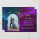 Den kelestiala Lilan Teal Guld Sol Måne Star Space Astronomy Mystical Galaxy Cosmic-Spara datumet har en guld sol, måne och stjärnor ram på en färgstark lila-, teal- och blå kosmisk bakgrund. Inuti finns ditt favoritfoto och din anpassningsbar sparar datuminformationen. Anpassa genom att redigera texten i textrutorna. Designad för dig ©Evco Studio www.zazzle.com/store/evcostudio