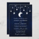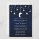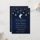 Celestial bröllopsinbjudan. Vattentärsblå natten himlar med stjärnor och måne. Bokeh string ljus. Rundad kant. Foto bakåt.