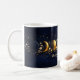 En morgonritual lika vacker som natthimlen. Denna fantastiska månfas-mugg med himlakroppstema visar hela måncykeln runt om – från nymåne till växande halvmåne, lysande fullmåne och vidare – mot en djup, marinblå bakgrund med ömtåliga vita blommor och spridda gyllene stjärnor.