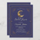 Celestial gold moon, stars, and frame on a violet background. Magical design perfect for a starry occasion. A fun astrology, horoscope, zodiac, celestial themed bachelorette trip invitation.
