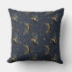 An elegant celestial pattern throw pillow featuring golden crescent moons, and scattered stars set against a deep blue background. Inspired by vintage astrology and mystical night skies, this seamless design blends luxury gold textures with cosmic symbolism.