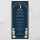 Höj evenemanget med vår Art nouveau-inspirerade meny! Med en strålande guldbåge, skuggande stjärnor och känsliga vita blommor som sätts in mot en djup marin bakgrund ger den här designen dig elegans till bord. Det är perfekt för bröllop, galas och storskaliga sammankomster! Observera att guld på den här produkten INTE är äkta folie, utan tryckt platt.