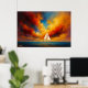 A lone sailboat glides across a tranquil sea, its white sails illuminated by the fiery breath of a swirling sky. Reds, oranges, and golds collide with deep blues and purples, creating a celestial storm of color and emotion. Above, a flock of birds cuts through the chaos, hinting at movement, freedom, and unseen destinations.