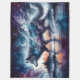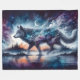 A majestic wolf strides across a dreamlike landscape, its body woven from stars, clouds, and ancient tree patterns. A crescent moon hovers above its back like a crown, illuminating the path between realms. Behind it, a fantasy city of spires and towers glows against a twilight sky of orange, violet, and deep blue. Reflections ripple below, blurring the line between sky and earth, reality and myth. This tapestry evokes themes of cosmic guardianship, spiritual journeying, and the quiet power of nature’s mysteries.