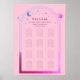 Den kelestiala Rosan Lila Sol Stars Mystical Bröllop Seating Chart Bröllop Sigant Download Digital Printable Poster Prints har en rosa och Måne lila, sol och måne och stjärnor ram på rosans bakgrund. Inuti ram finns texten "Välkommen" i kalligrafiskriptet för elegant rosa och informationen i personligt bröllp-mottagningsdiagrammet. Designad för dig ©2022 Evco Studio www.zazzle.com/store/evcostudio