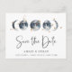 Tungfärgscelestial måne-faser med gyllene zodiakkonstellationer, bröllop spara datum-vykort. Kortet har elegantens calligrafi "Save the Date" (Spara datum), på framsidan och baksidan.