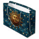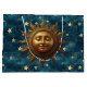 Amid a starry celestial background, the serene face of a stylized golden sun.