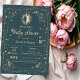 Celestial gold sun and moon, and stars on a watercolor sage green background. These baby shower invitations are easily customized for your event by simply adding your details.