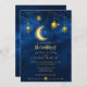 Denna vackra akvarelldesign har en stor lysande halvmåne med stjärnor och planeter på en blå midnatt himmel bakgrund. Baksidan av kortet har samma midnatt himmel bakgrund med en stor lysande halvmåne. Denna vackra inbjudan är en del av en matchande brölloppsserie som kan fullständigt anpassas.