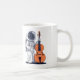 Ett unikt mugg med en karikatyrastronaut i vitt avstånd som spelar en orange-brun cello mot en solid svart bakgrund. Perfekt för musik- och rymdentusiaster!"