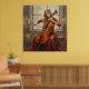 En ung blond kvinna i en flytande röd klänning spelar cello graciöst vid ett solbelyst fönster, fångad i mjuka, impressionistiska penseldrag som frammanar tidlös elegans och musikalisk passion.