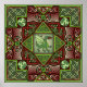 En stiliserad drake sitter i centrum av en labyrint med djupt rött och oliv grönt keltiskt knopp. Är draken fångad i centrum eller är det labyrintens mästare?