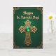 The front design shows a tall, elegant layout centered on a golden Celtic cross covered in detailed knotwork, set against a deep emerald green background that feels rich and inviting. A large oval green gem sits at the cross’s center, catching the light like a shared glance that lingers a little longer between close friends. The gold details shimmer warmly against the darker green, giving the whole scene a cozy, close-to-the-heart look 💚. A thin gold border runs around the edges, and curled Celtic flourishes decorate the corners like gentle embraces. Near the top, the words “Happy St. Patrick’s Day!” appear in gold lettering, placed above the cross so your eye naturally drops down to the jewel. The setting stays simple and focused, letting the cross and gem feel like a small treasure offered with care ☘️. Gold corner swirls, a neat gold frame, and the luminous green stone stand out crisply on the velvety emerald field.