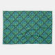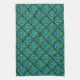 En kökshandduk med en blå grönt Celtic Knot med upprepad diamantdesign mot svart bakgrund.