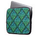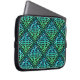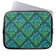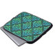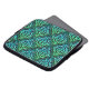 Ett laptop sleeve med en blå grönt Celtic-symbol med upprepad diamantdesign mot svart bakgrund.