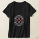 En svart kvinnas v-nacke t-shirt med en keltisk knallisk design med en röd kvadrat kor i mitten.