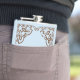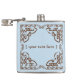 En vinylinslagen höftkolv som dekoreras med ett keltiskt inspirerat gräns, med redo för centraltext för att visa ditt personliga budskap, citat eller namn. Detta är en ursprunglig utformning men påverkas av keltiska källor. Intervävd knopp var ett vanligt förekommande inslag i det keltiska metallverket, stenoskärmsarbetet och smyckena.