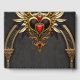Celtiska knop och ett hjärta i den gotiska elegansen. Den gotiska inspirerade ramar omfattar elegant guldbågar och kolumner som påminner om gotiska katedraler. Dessa inslag är finmaskigt utformade och dekorerade med berusat keltiskt knut mönster. En ängslig hjärtemblem, med pulserande röda juveler, sitter inklämd i övre delen av ram. Grund i ram domineras av en gyllene skallkonstruktion som symboliserar både styrka och mysterium.