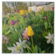 The image on this product depicts a garden of Spring flowers; the colorful blooms in lovely hues of yellow, white, pink, purple, lavender, and fuchsia, with a fun polka dot trim.