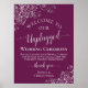 Detta vackra "opluggade" tecken som fungerar som ett trevligt hälsning för dina gäster i bröllop och som också ber dem att stänga av telefoner, kameror och prylar, vilket garanterar en sömlös och oavbruten ceremoni. Tecknet visar en magenta för elegant eller en kassidesign för lila och silver med rostig kursiv grafi och utvecklar silver-grått-faux-folie och snurrar runt hörnen. Budskapet lyder: Välkomna till vår Bröllop-Ceremoni som inte är ansluten. Stäng av Telefoner, kameror och anordningar så att vi alla kan njuta av Ceremonin utan avbrott.