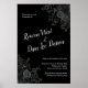 Vår skylt om gothisk bröllop i den svarta och vita blommigten är gjord för att matcha uppsamlingen av Gothic Black Ro Bröllop. Mörkens svarta och ljusvita kontrast med en mängd motiv för mörkens blommigt. Skriptteckensnitt parat med serif-teckensnitt ger ett konstnärligt utseende som passar bra ihop med gothic stil.