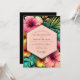 Immerse your special day in a vibrant, tropical paradise. This bold design features brilliant cerise and yellow hibiscus blossoms bursting forth from a dark, moody background. Lush monstera and palm leaves in shades of teal and emerald green complete this exotic and dramatic botanical arrangement.