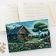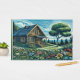 En linoprint av en kalk som satts upp i fredligt backe med förgrund av färgade blommor