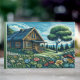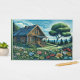 En linoprint av en kalk som satts upp i fredligt backe med förgrund av färgade blommor