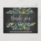 Tack för det här chalkboard-lövet du vycard är perfekt för ett bröllop. Utformningen har en ram av grönt löv och lövgiga botaniska ämnen på en kol-grått-kritbakgrund. Anpassa kortets framsida med ett kort-meddelande. Anpassa baksidan med ett längre tackmeddelande. Du kan också lämna tackmeddelandemallsavsnittet på baksidan om du vill att skrivan ska förses med en tankfull personlig på varje vykort när de har anlänt. De här vykorten kan användas för möhippa, bröllop eller speciella händelser.