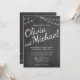 Chalkboard-inbjudan med String Ljus för ett bröllop. Namnen för bruden och brudgummen skrivs i ett stort skript över sidan. Du kan ändra typsnitt, font färg och all text. Inbjudan matchar en samling i min butik.