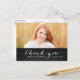 Tack för ditt kort, Trendig White Script Rustic Studenten. Design av Elke Clarke © Besök vår butik www.zazzle.com/monogramgallery* för mer färg och stilar. Lägg till eget foto och egen text. Ett vanligt, handskrivet skript med vit typografi täcker över en svart bakgrund på ritytan (utskriven fotoeffekt) med orden "Tack". Byt ut exempelfotot mot ditt eget.