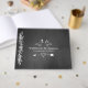 Kritbordet i vintage stil ser ut som gäst i bröllop med bilder av vit love birds, pil och hjärta och blomsterträdgård. Anpassa den vita texten fält för din speciella dag.