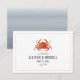 En rustik nautisk bröllopsinbjudan med en illustration av en röd krabba med grå text och urblekt röd randig design på framsidan. Baksidan har en akvarellinspirerad chambray-design.